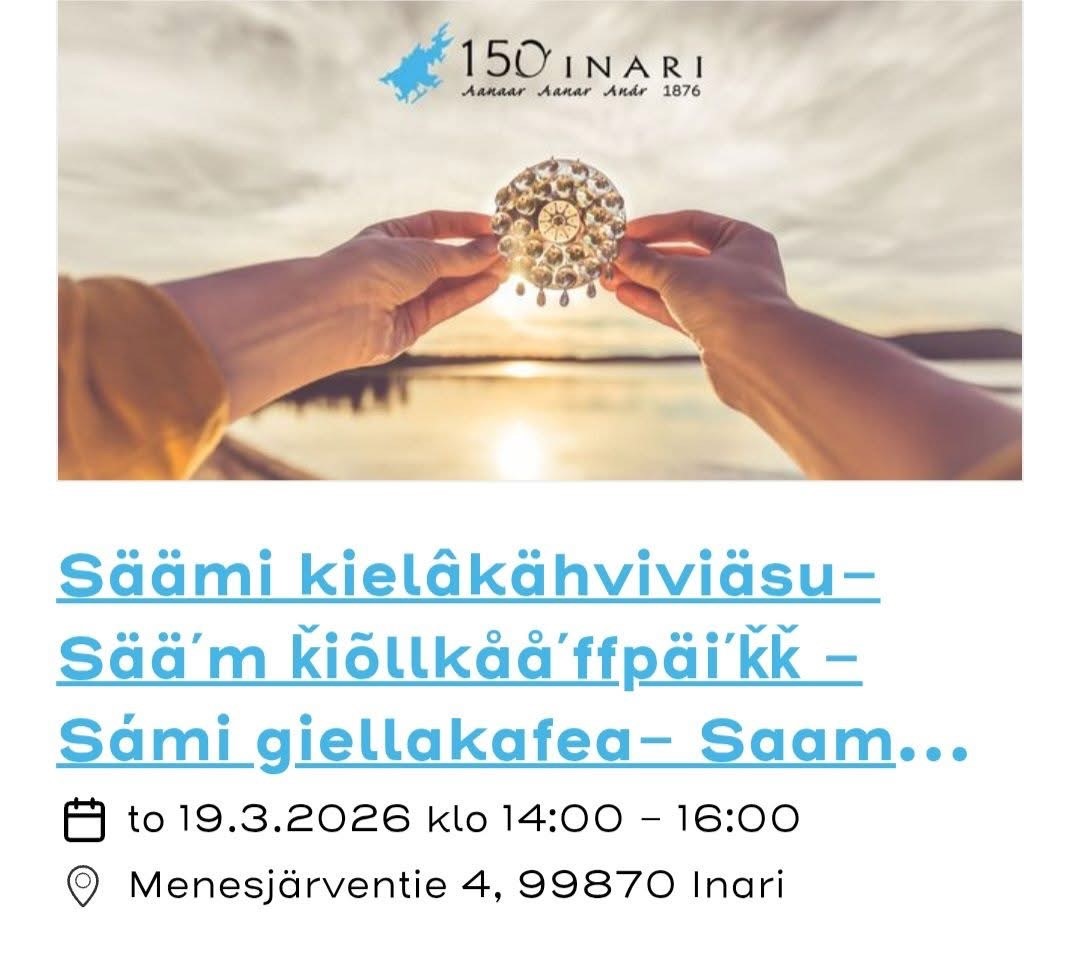 Julkaistu 16.3.2026 Muokattu 16.3.2026Saamen kielikahvila -Säämi kielâkähviviäsu- Sääʹm ǩiõllkååʹffpäiʹǩǩ - Sámi giellakafea järjestetään yhteistyössä Inarin kunnan kanssa.